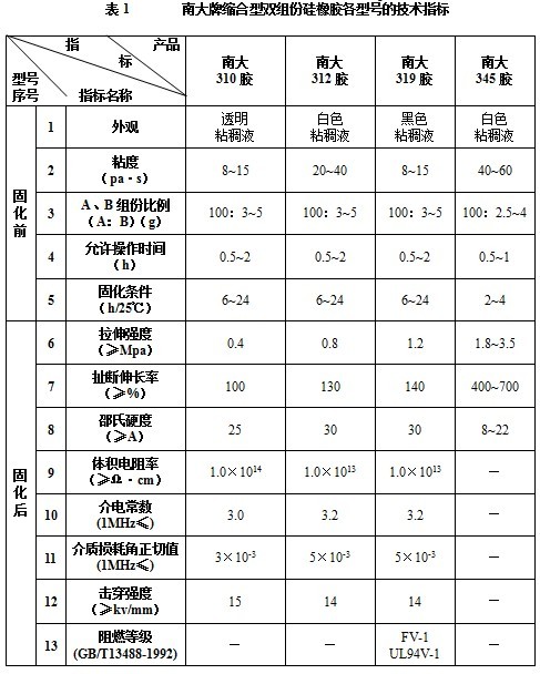 南大300系列RTV硅橡膠主要產品介紹 表一
